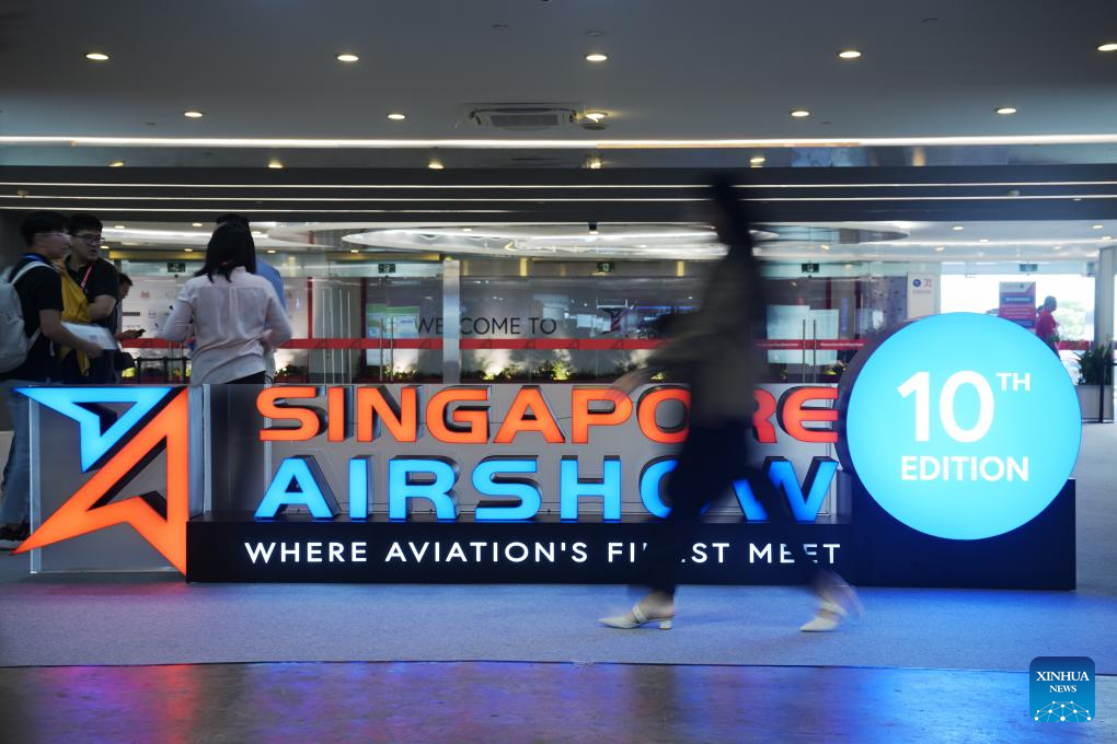 People walk past a signboard during the 10th Singapore Airshow at Singapore's Changi Exhibition Centre on Feb. 4, 2026. (Photo by Then Chih Wey/Xinhua)