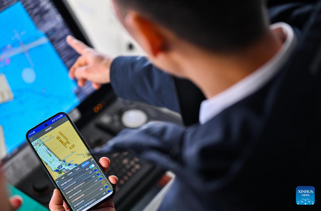 Xu Qinping checks the movement of a cargo ferry through his cellphone at Tianjin Port in Tianjin, north China, Feb. 4, 2026. (Xinhua/Zhao Zishuo)