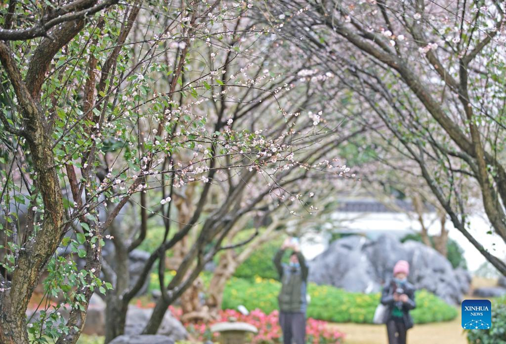 A citizen takes photos of plum blossoms in Qingxiu Mountain scenic area in Nanning, south China's Guangxi Zhuang Autonomous Region, Feb. 13, 2022. The Qingxiu Mountain scenic area has attracted many tourists as plum trees are in blossom in early spring. (Xinhua/Zhou Hua)