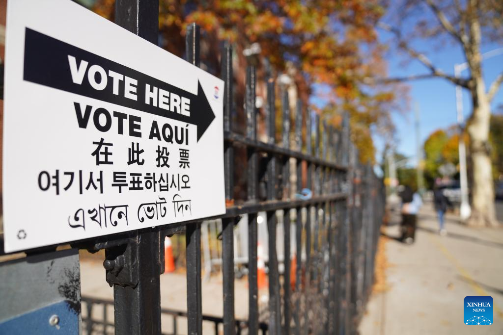 A sign pointing to a polling station is seen in Queens, New York City, the United States, on Nov. 4, 2025. The New York City mayoral election took place on Tuesday. (Xinhua/Zhang Fengguo)