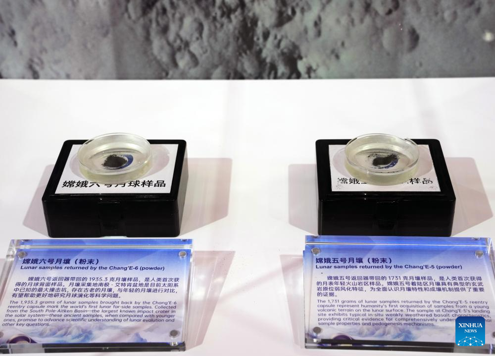 Lunar samples retrieved by China's Chang'e-5 and Chang'e-6 missions are displayed at the China Pavilion during the eighth China International Import Expo (CIIE) in east China's Shanghai, Nov. 5, 2025. The eighth China International Import Expo (CIIE) opened in Shanghai on Wednesday. The highlights of the China Pavilion include the latest achievements of China in comprehensively deepening reform and high-level opening-up during the 14th Five-Year Plan period (2021-2025). (Xinhua/Liu Ying)