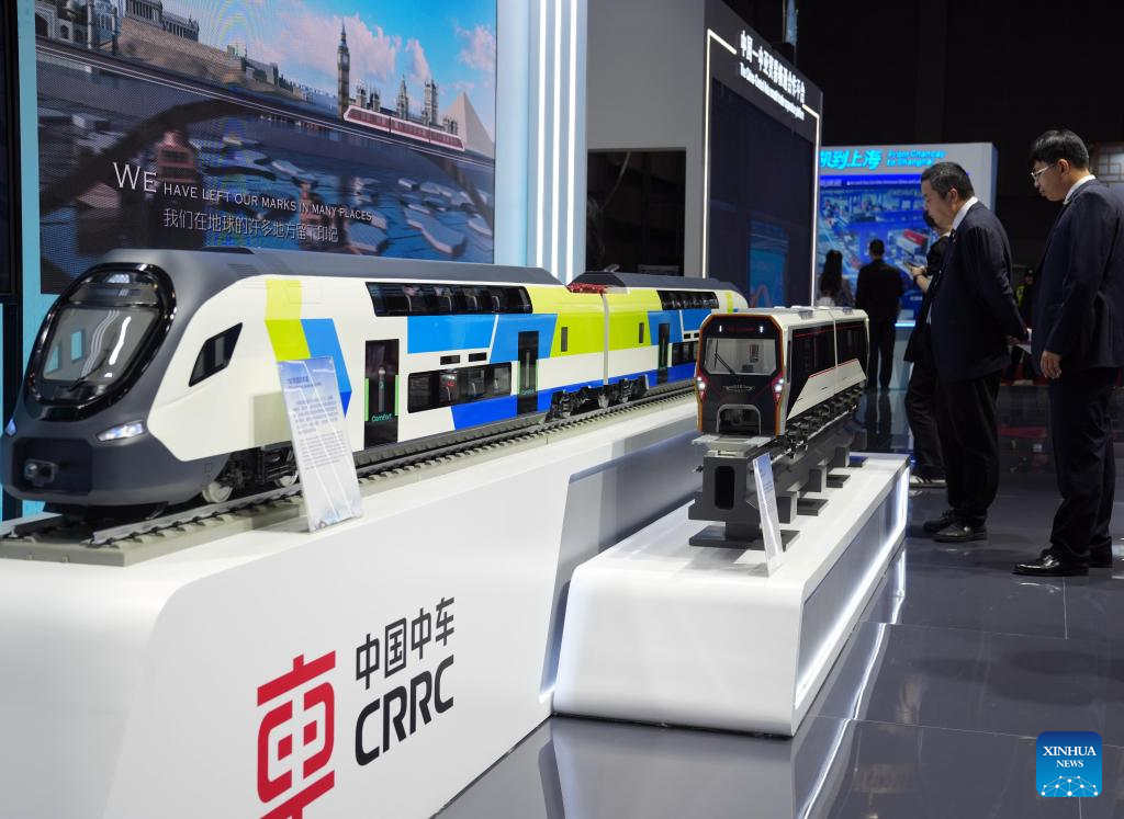 A double-deck electrical multiple unit (EMU) train model and a maglev train model are displayed at the China Pavilion during the eighth China International Import Expo (CIIE) in east China's Shanghai, Nov. 5, 2025. The eighth China International Import Expo (CIIE) opened in Shanghai on Wednesday. The highlights of the China Pavilion include the latest achievements of China in comprehensively deepening reform and high-level opening-up during the 14th Five-Year Plan period (2021-2025). (Xinhua/Liu Ying)