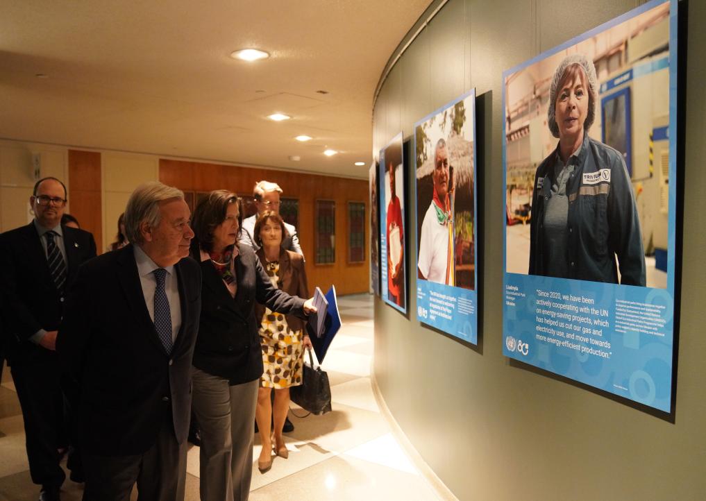 10月20日,在位于纽约的联合国总部,联合国秘书长古特雷斯(前)参观“共栖生命,共享未来”庆祝联合国成立80周年全球图片展。