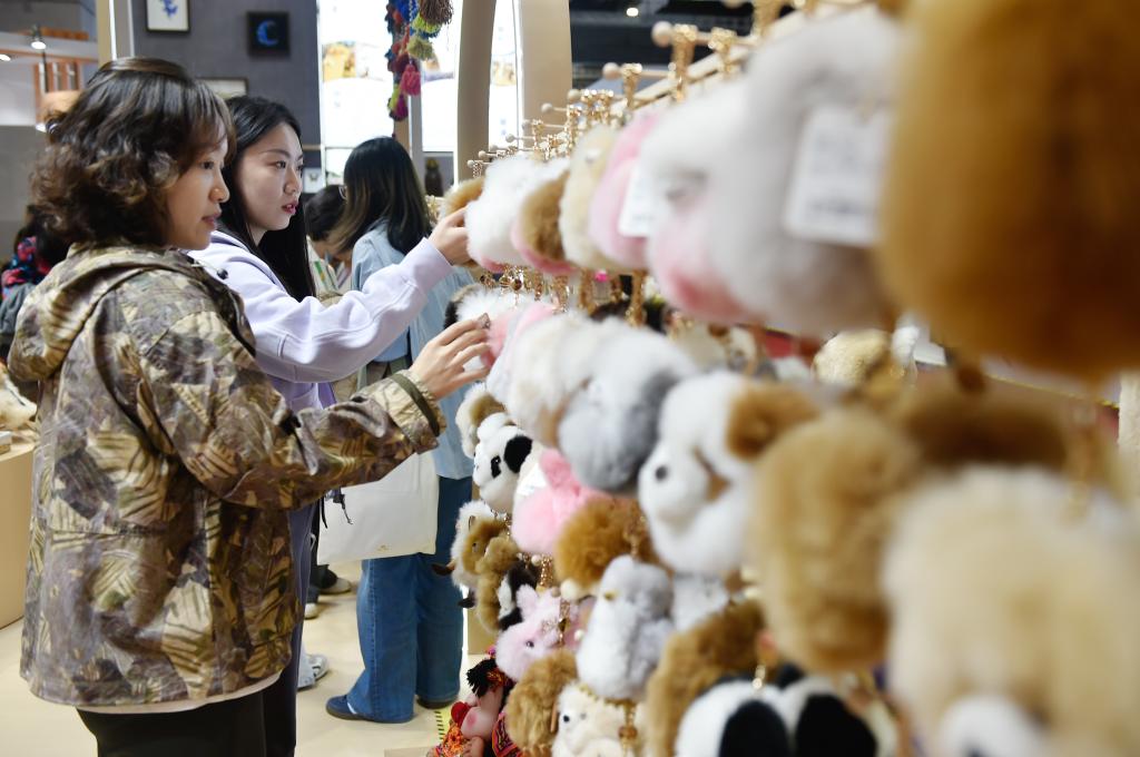 11月5日,观众在第八届进博会消费品展区选购毛绒玩具。