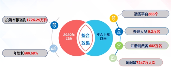 隨著熱線平臺的整合優化,2020年,全國市場監管部門通過12315熱線及平臺接收的公眾訴求大幅增加,全國12315平臺訪問量達7247萬人次,累計注冊公眾用戶682萬人,全國市場監管部門依托12315平臺共處理投訴舉報咨詢1726.29萬件(受統計范圍擴大、業務板塊增加的影響,數量明顯高于往年),投訴舉報處理時長縮短5.35天。整合后新增的產品質量、食品安全、價格、藥品等業務,占投訴舉報總量的33.51%。通過整合建設12315熱線及平臺,有力促進了市場監管部門各項業務融合,重構了投訴舉報處理模式,推進了市場監管投訴舉報業務的整體運轉、程序統一、銜接順暢和高效處置,為消費者維護自身合法權益提供了更多便利。