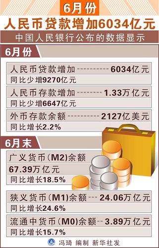 6月份人民幣貸款增加6034億元