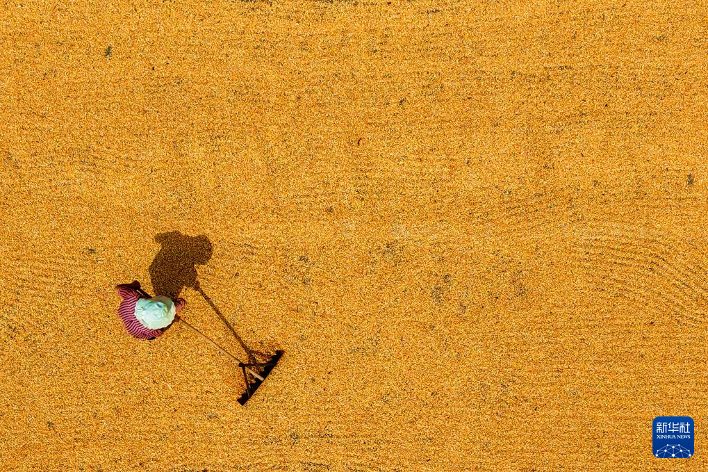 9月11日,湖南省衡阳市衡东县石滩乡村民驾驶农机收割稻谷(无人机照片)。