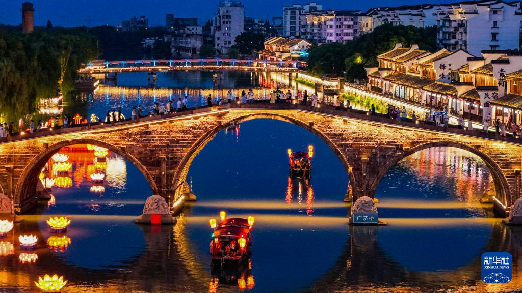 国庆中秋假期,浙江省杭州市临平区塘栖古镇推出“月满运河·梦栖塘栖”祈福之夜活动。游客们可以体验运河摇橹船夜游、赏运河花灯、广济桥赏月等特色活动,感受水乡古镇的运河雅韵。这是10月2日在塘栖古镇拍摄的运河夜景(无人机照片)。