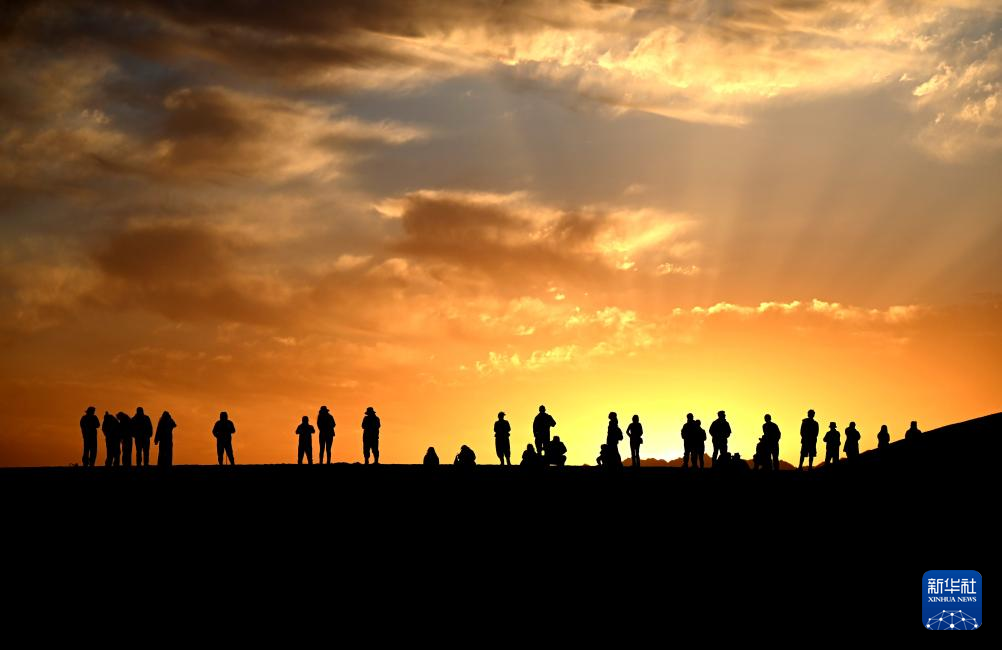 国庆中秋假期,人们以多种多样的方式,乐享美好时光。这是10月2日清晨,游客在甘肃省敦煌市鸣沙山月牙泉景区观赏大漠日出美景。