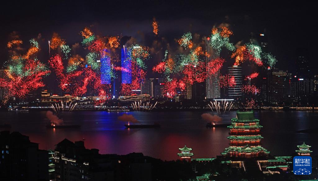 10月1日,2025年南昌市国庆烟花晚会在江西省南昌市赣江老官洲水域举办。
