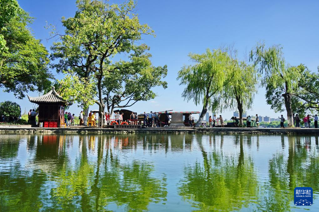 10月10日,游客在浙江省嘉兴市南湖景区湖心岛参观游玩。
