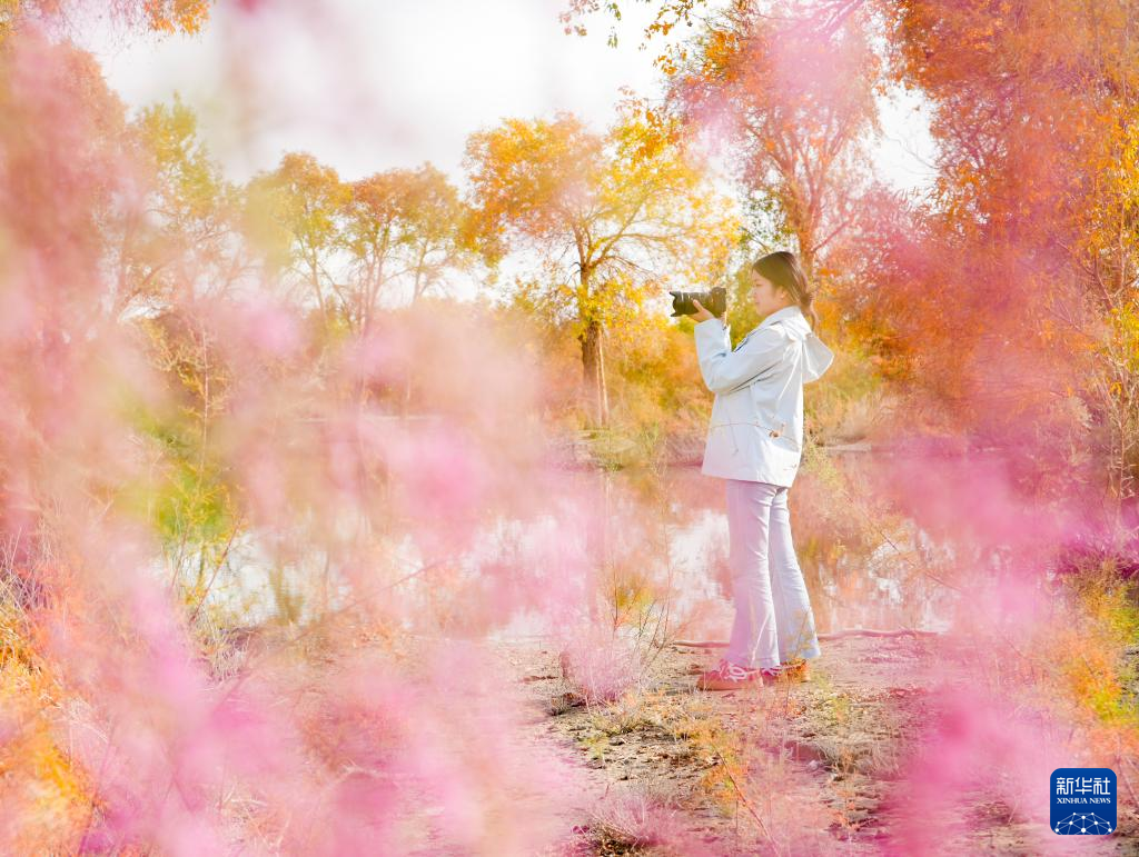 金秋时节,新疆巴音郭楞蒙古自治州尉犁县境内的沙漠胡杨景观与塔里木河互相映衬,美不胜收,吸引不少游客观光游览。