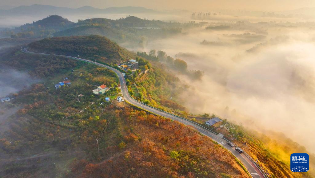 这是11月4日在山东省临沂市沂南县界湖街道拍摄的被云雾笼罩的朱家岭村(无人机照片)。