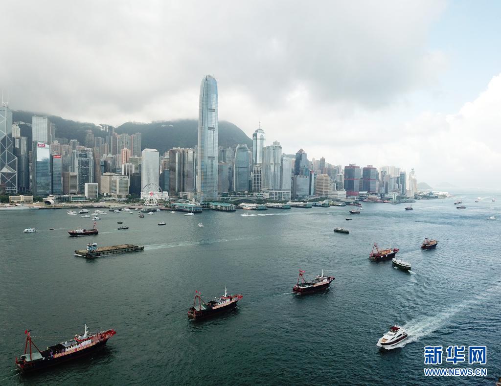 7月1日,插滿旗幟的漁船在香港維多利亞港巡游(無人機(jī)照片)。新華社記者 李鋼 攝