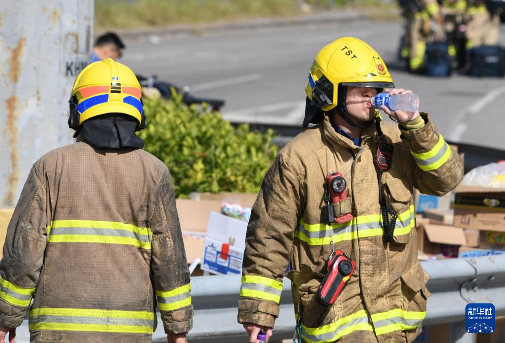11月28日,在香港大埔区宏福苑火灾救援现场,消防员休息饮水。新华社记者 陈铎 摄