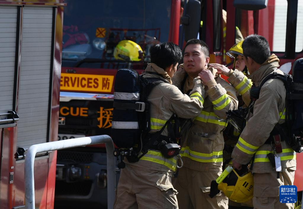 11月28日,在香港大埔区宏福苑火灾救援现场,消防员互相整理防护装备。新华社记者 陈铎 摄
