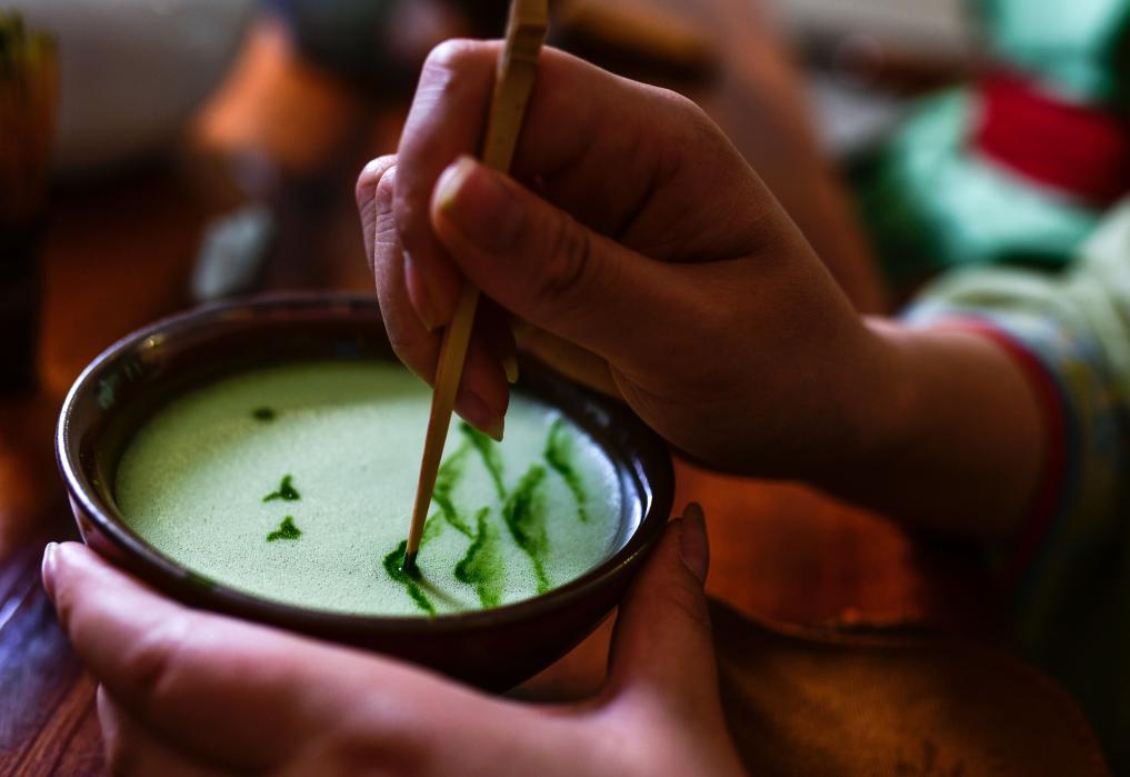 5月14日,在贵州省江口县贵茶产业园茶室,茶艺师在制作抹茶茶饮。