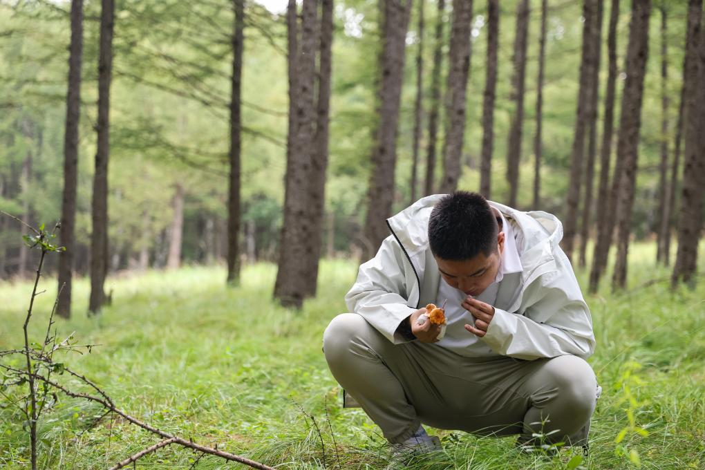 8月17日,王剑书在河北承德御道口草原森林里采蘑菇。