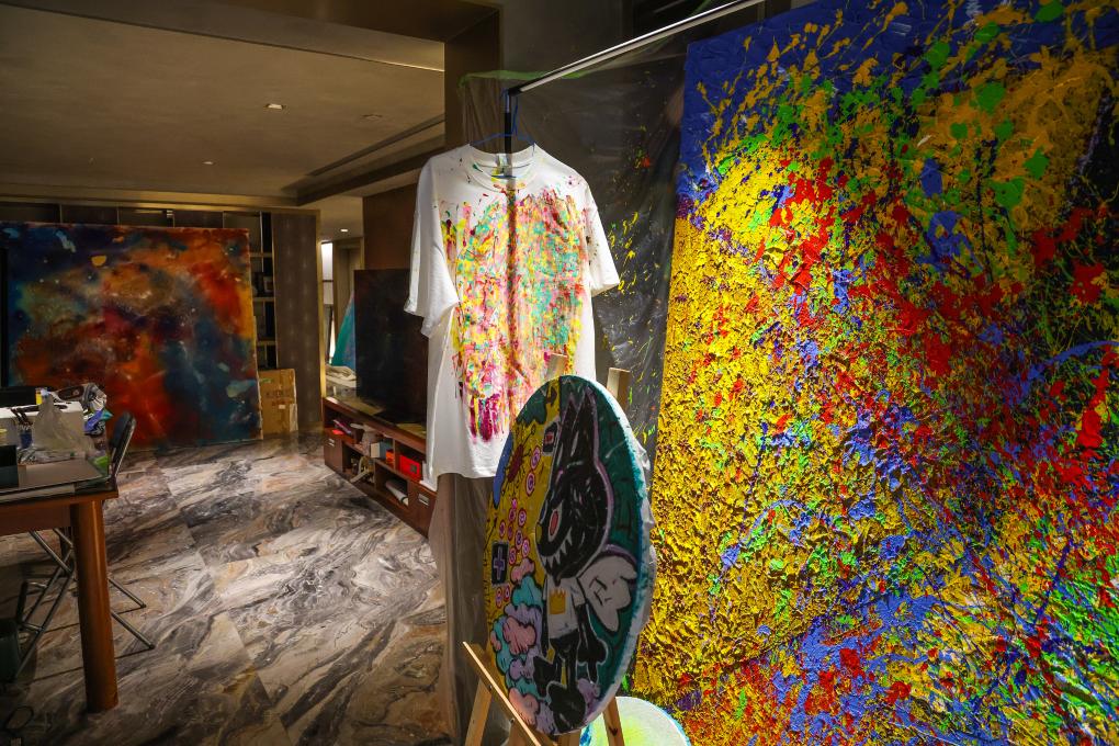 8月8日,王剑书在北京的画室创作滴洒画时,开心得跳起来。