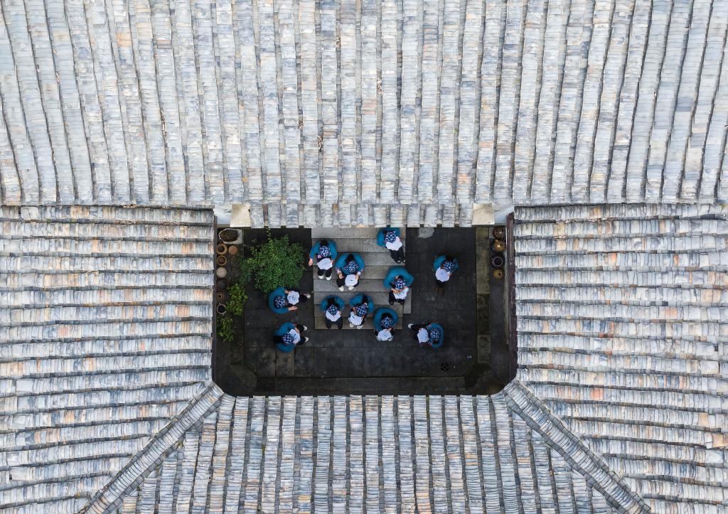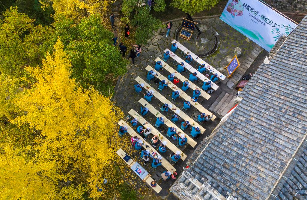 11月2日,绣娘代表在湖北省宜昌市秭归县屈原故里景区芈绣馆参加刺绣技艺比赛(无人机照片)。