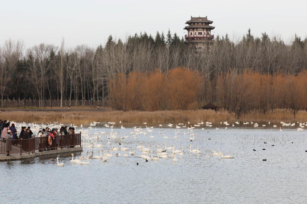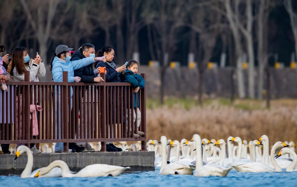 12月20日,游人在河南省三门峡市天鹅湖国家城市湿地公园观赏天鹅。