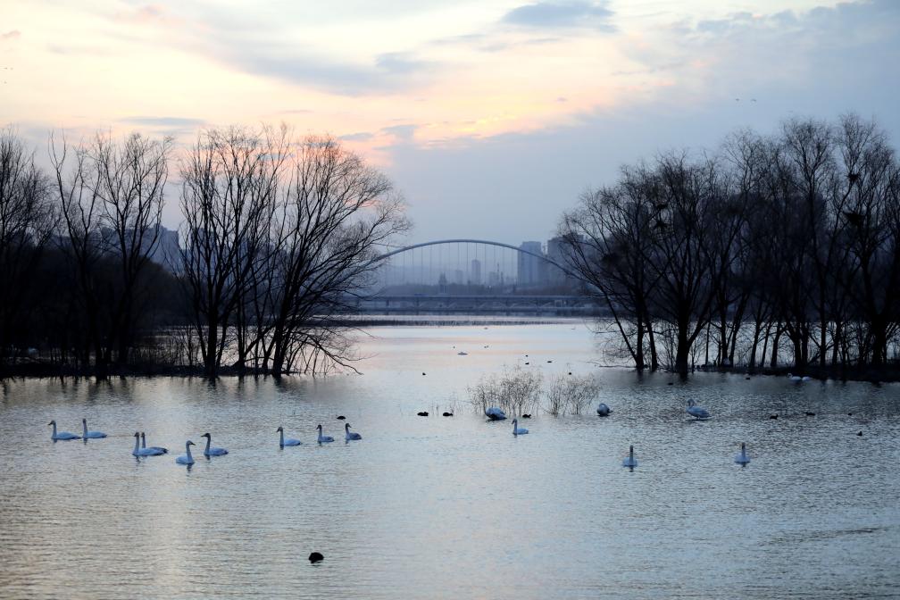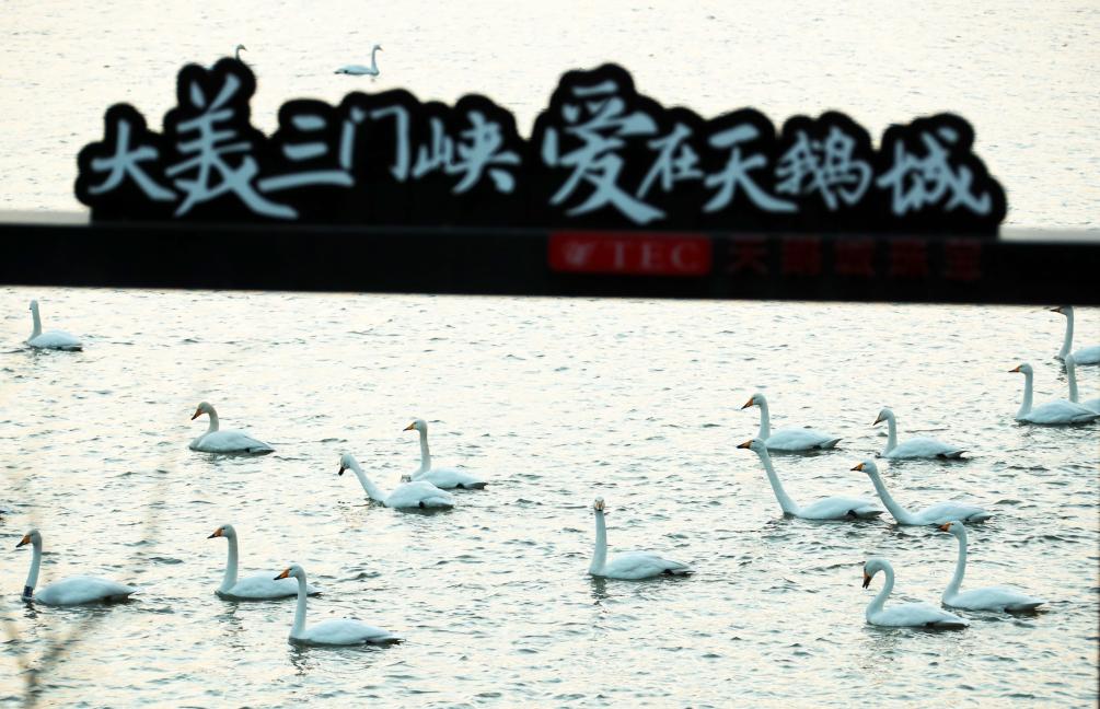 12月20日在河南省三门峡市天鹅湖国家城市湿地公园拍摄的天鹅。