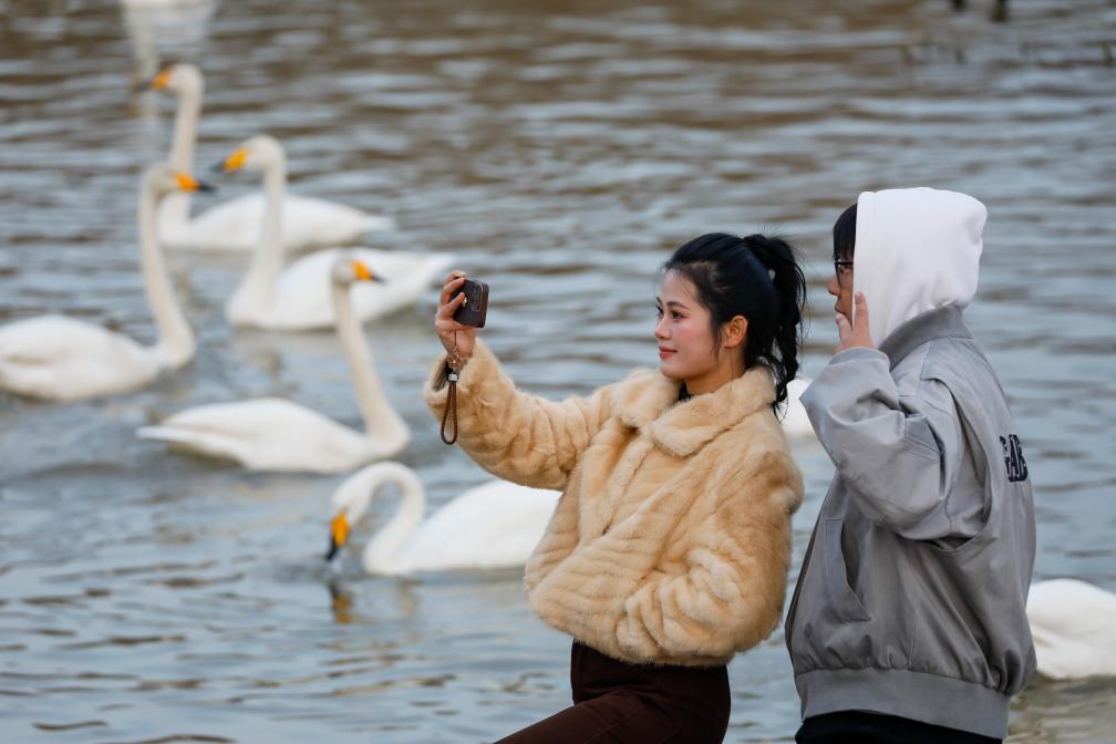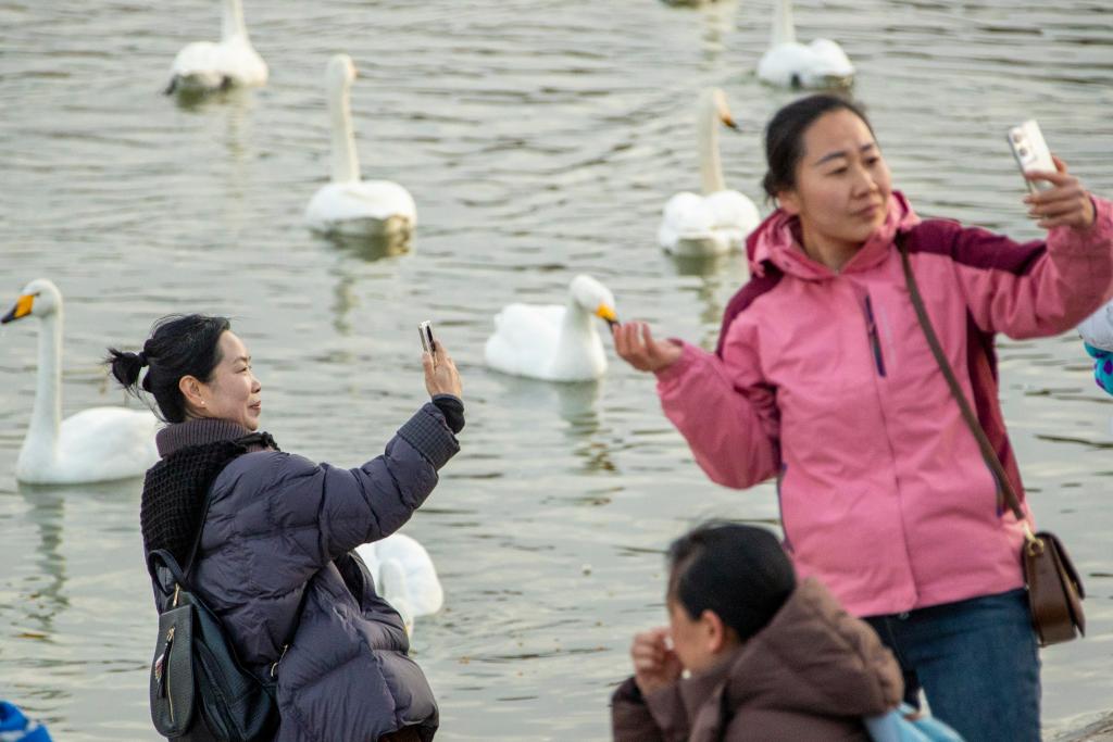 12月20日,在河南省三门峡市天鹅湖国家城市湿地公园,游客与天鹅合影。