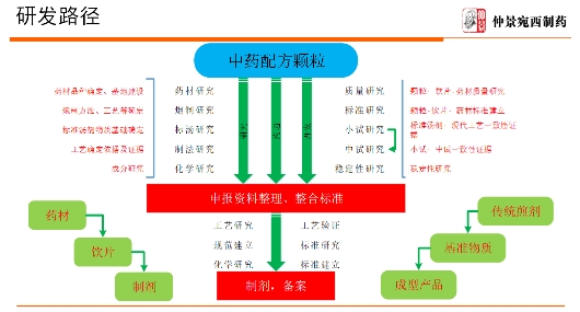 中藥配方顆粒的研制路線是從產品研制開始,要經過標準復核、現場檢查、專家評審等環節,最終需獲得藥監管理部門的備案許可。研制路徑的重點主要是前期大量文獻的調研、過程中質量控制的一致性研究和工藝的穩定性、有效性再評價等,對企業的研發、人才及經濟方面的投入要求非常高。