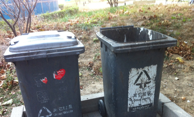 除了幾棵大樹之外,小區基本上沒有綠化,以前貌似種過綠草的地方,如今枯黃一片。垃圾桶早就已經破舊不堪,在殘留的文字上,依稀可見當時也曾嘗試過的垃圾分類。小區內沒有兒童休息場所、也沒有健身器材,只是設有幾個孤零零的座椅。