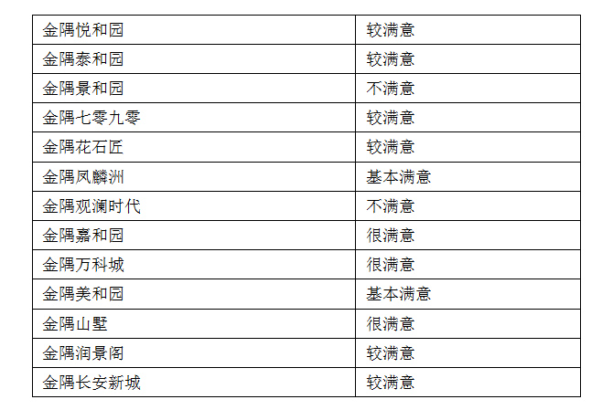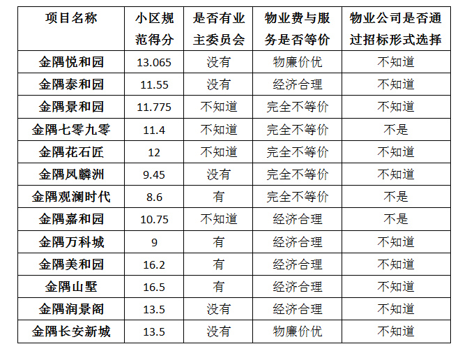 由上圖顯示,在目前的物業服務調查過程中,,有金隅項目得分最高,為28.5分,金隅觀瀾時代得分最低,為12分。