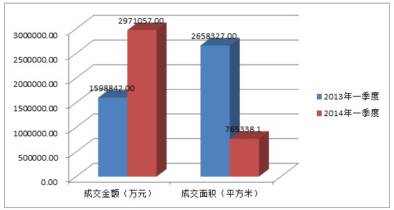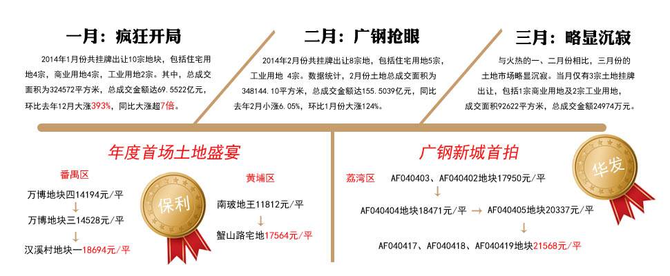 回顧一季度的廣州土地市場,似乎仍在延續(xù)去年的火熱局面。據新華網監(jiān)控廣州國土房管局網站顯示,2014年第一季度,廣州(不含增城、從化)共賣地21宗,均為掛牌出讓,其中住宅用地6宗,商業(yè)用地8宗,工業(yè)用地7宗。總成交面積為765338.1平方米,總成交金額達227.5535億元,成交金額同比大漲85%。
