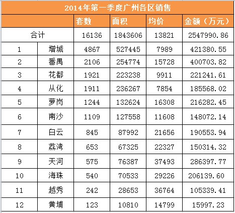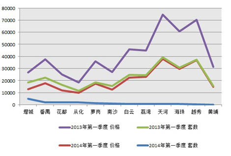 根據房王網統(tǒng)計數(shù)據顯示,2014年一季度廣州十區(qū)二市網簽一手住宅16136套,同比2013年第一季度成交(27042套)下跌約40%,環(huán)比下跌32.5%;成交面積1843606平方米,同比下跌42.1%,環(huán)比下跌30.2%;成交均價13821元/平,同比下降0.2%,環(huán)比上升1%。