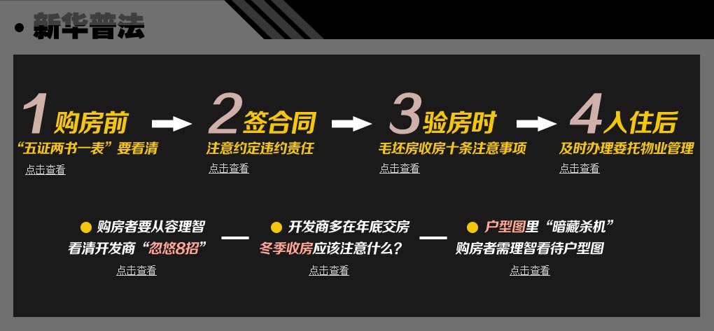 購房前——“一照”、“五證”要看清 簽合同——注意約定違約責任 驗房時——毛坯房收房十條注意事項 戶型圖里“暗藏殺機” 購房者需理智看待戶型圖 開發商多在年底交房 冬季收房應該注意什么? 戶型圖里“暗藏殺機” 購房者需理智看待戶型圖