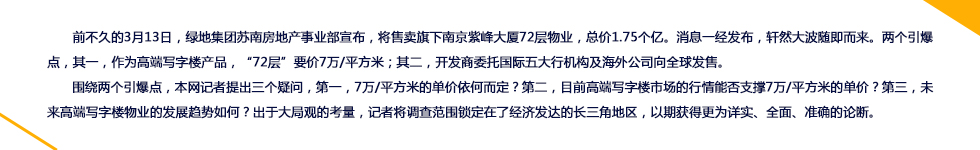 戴德梁行華東區寫字樓部董事沈潔表示,南京超甲級寫字樓的最高租金報價為5.5-6元/平方米/天,無法支持7萬/平方米的售價,所以“該價格不具有參考意義”。…[詳細]