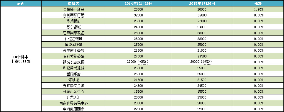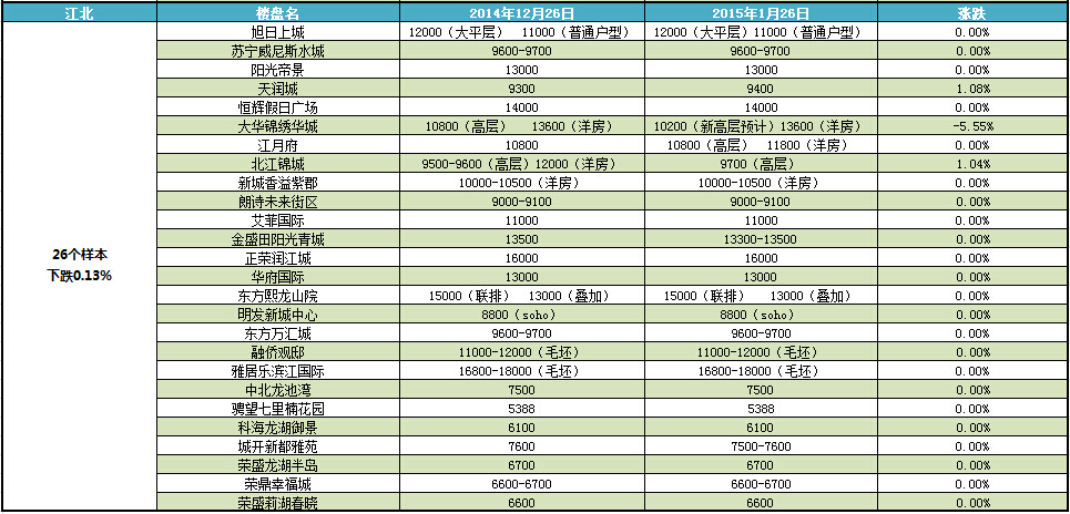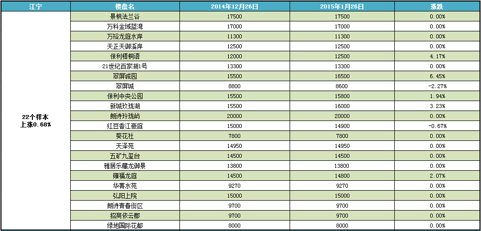 新華房產記者統計發現,2015年1月南京樓市八大板塊中,江寧、仙林、河西、城東房價上漲,江北房價下跌,其余板塊房價無變動。 綜合結果,1月房價環比微漲0.22%。[詳細]
