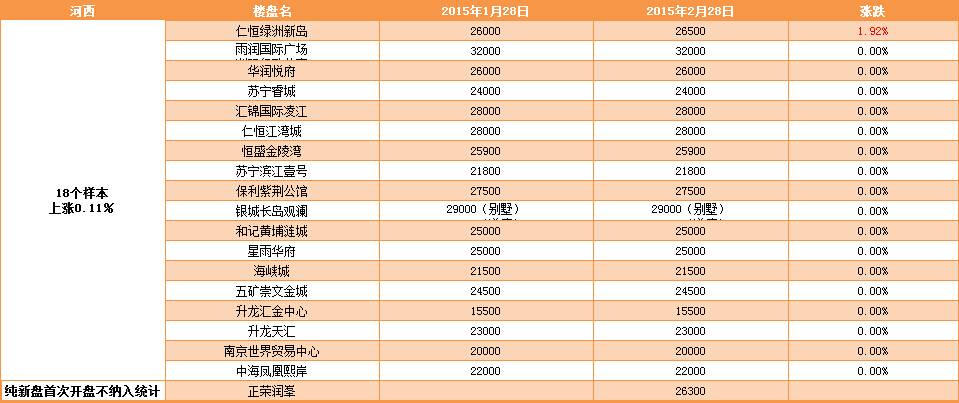 新華房產記者統計發現,2015年2月南京樓市八大板塊中,江寧、河西、城東房價上漲,江北房價下跌,其余板塊房價無變動。 綜合結果,2月房價環比微漲0.12%。 [詳細]
