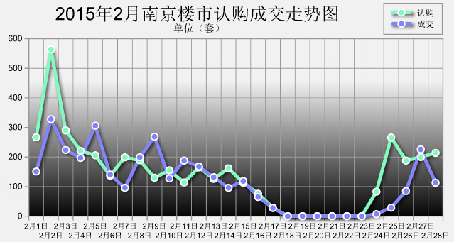截止到2月28日,南京網上房地產數據顯示,2月南京樓市新房認購4094套、成交3295套,日均賣房146套。環比上月(備注:2015年1月南京樓市商品住宅認購6937套、成交6349套,日均賣房132套)認購量下跌4成,成交量下跌近5成。 與去年相比(備注:2014年2月南京樓市商品住宅認購3574套,成交3459套,日均賣房127套)。認購量上漲15%,成交量下跌4.7%。 …[詳細]