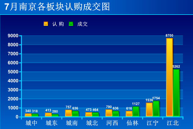 成為國家級新區后,江北表現異常出色。7月江北賣房8700套,占了全南京賣房量的63.21%。江寧1536套緊隨其后,河西以730套的認購量進入三甲。 上市量方面,在新區利好下,江北不少開發商乘勢加推。據新華網統計,7月江北共計10盤攜手2019套新房源入市。其中華潤國際社區、明發香山郡、正榮潤江城、萬科璞悅山和招商蘭溪谷均當日售罄。相較于江北板塊,其余板塊表現稍顯遜色。河西僅一盤加推,河西南部純新盤佳兆業城市廣場推出123套房源,當日售出8成房源。仙林3盤入市,共計292套新房源,其中主力貢獻來自仙林湖的新城香悅瀾山,該盤7月28日,加推216套新房源,當日去化8成。 [詳細]