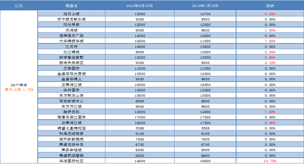 據新華房產統計發現,2015年7月南京樓市八大板塊中,除河西板塊,其余板塊房價均出現上漲,江北以1.76%的漲幅領漲南京房價。綜合結果,7月房價環比微漲0.71%。 [詳細]