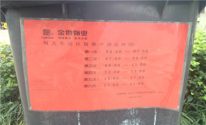 物業(yè)服務(wù)方面業(yè)主總體表示很滿意,其中一位陳姓業(yè)主告訴記者:“小區(qū)內(nèi)定期會(huì)有專人進(jìn)行綠化養(yǎng)護(hù)和衛(wèi)生保潔,環(huán)境非常好。”同時(shí),記者還發(fā)現(xiàn)基本上小區(qū)內(nèi)垃圾桶上都貼有明確的每日清運(yùn)時(shí)間,非常人性化。