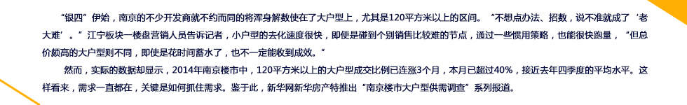 點評:世聯行高級研究員董曄分析指出,與定位剛需客群的中小戶型不同,南京樓市大戶型房源的消化量已基本處于穩定狀態,“且受到政策、金融環境的影響比較小。” 這一方面說明大戶型具有持續的、固有的消費力和需求量,同時也提醒開發商思考:如何在有限的“水池”中“撈魚”?…[詳細]