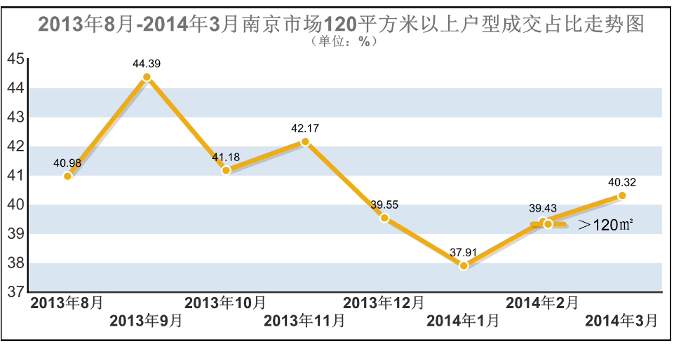 根據世聯行獨家提供的數據,今年一季度三個月,南京樓市中戶型建筑面積在120平方米以上的新增商品房成交比例分別達到了37.91%、39.43%及40.32%。 經新華房產記者計算,三個月月均以1.2個百分點增長,平均銷售占比達39.22%,即“10個購房者中就有4個選擇了大戶型”。[詳細]