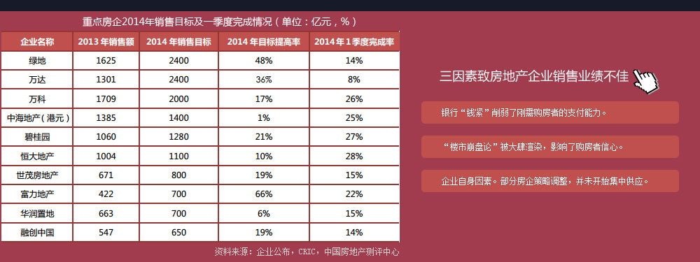 萬科、碧桂園、龍湖等企業,不約而同地將增速確定在20%或略低。萬科目標銷售額為2000億,較去年的1709億增長17%。龍湖目標銷售額570億,增速20%,與上年持平。中海2014年銷售額目標增幅僅為1%,比去年的1108億只增加12億,到1120億元。綠城目標銷售600億,較去年的553億,僅增長8.3%。