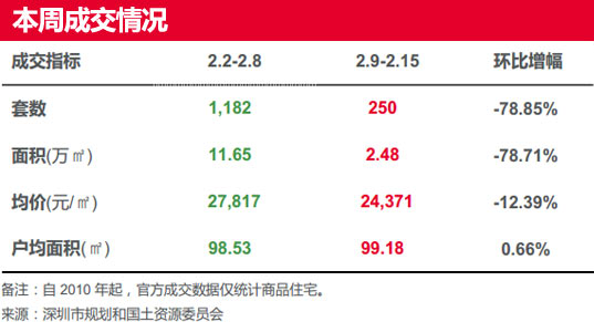 由于春節假期將至,并且本周(2.9-2.15)無新盤入市,深圳一手住宅成交套數及成交面積下跌均接近八成;成交均價下跌超一成。