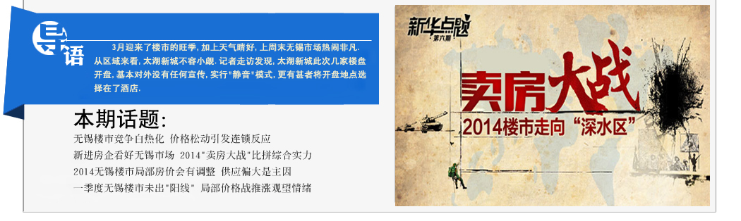 無錫在全國房地產(chǎn)市場中的知名度不斷提高,每年都有近百人次房企來錫考察洽談,每年有5家左右外來房企落戶無錫,無錫的房地產(chǎn)市場也呈現(xiàn)出百家齊放的勢態(tài),越來越多的外來房企看中和關(guān)注無錫。對于2014年無錫市場預(yù)期,品牌房企有何預(yù)判?