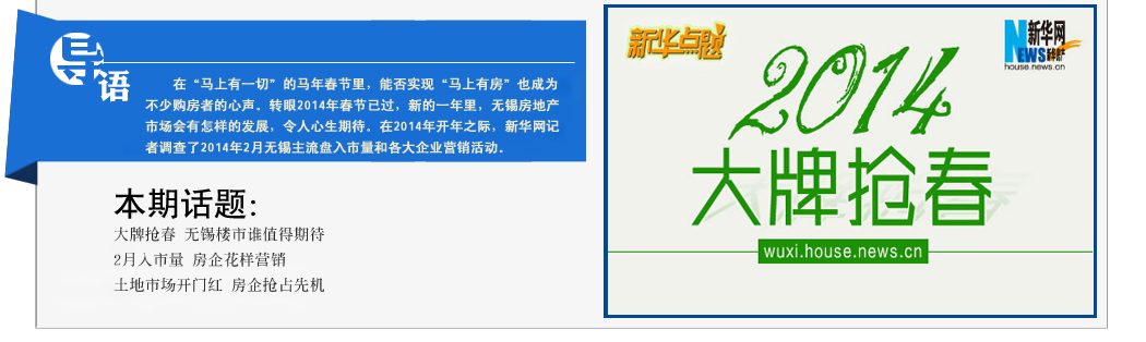 據新華網統計,無錫2月主流在售樓盤預計上市18家。從區域上來看,其中新區2個、濱湖區4個、錫山區3個、惠山區2個、崇安區3個,南長區3個、北塘區1個。其中在計劃開盤的18主流盤中有4個純新盤,其余樓盤都為老盤加推。