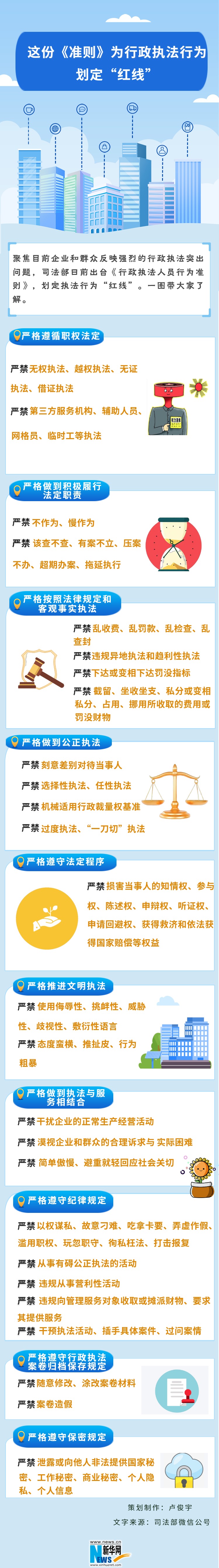 聚焦目前企业和群众反映强烈的行政执法突出问题,司法部日前出台《行政执法人员行为准则》,划定执法行为“红线”。一图带大家了解。