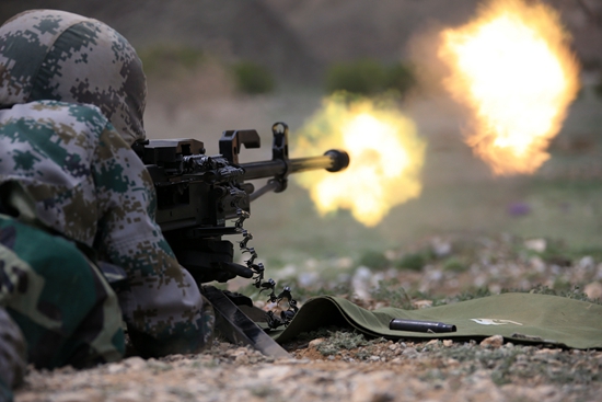 2016年4月25日,西部戰區陸軍某團機槍連官兵攜帶重機槍對“敵”目標實施火力打擊。視覺中國供圖(資料圖片)