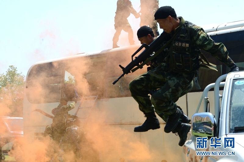 特勤隊官兵對藏匿在公共汽車內的“歹徒”進行突擊。