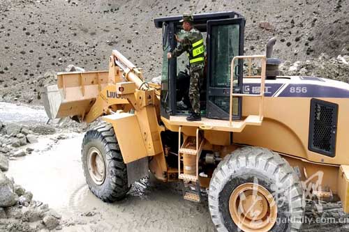 圖為邊防官兵正在指揮鏟車進行搶修道路